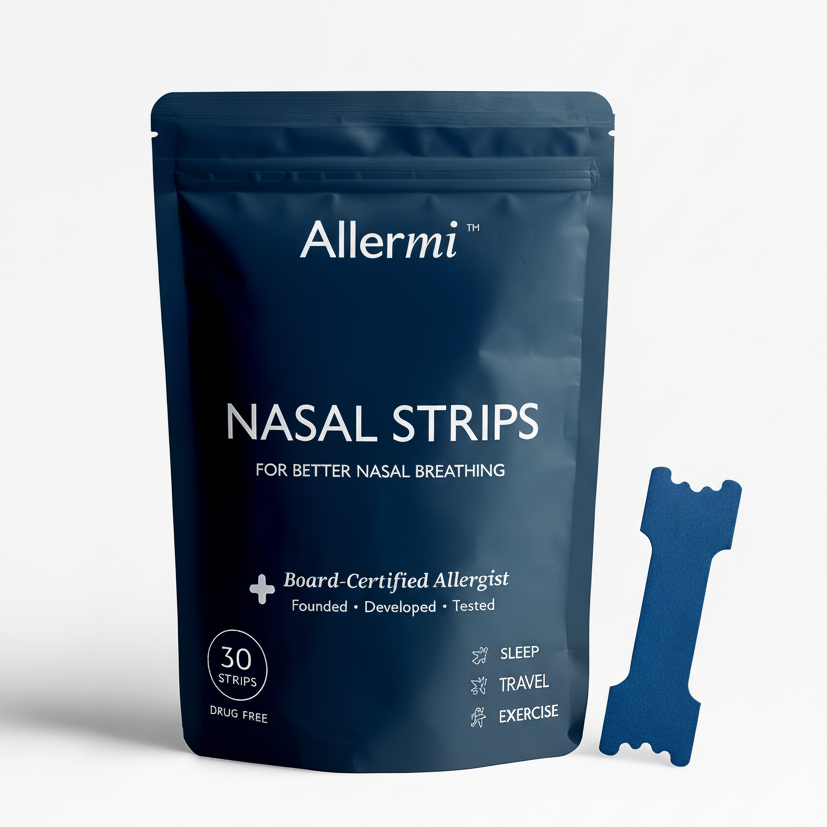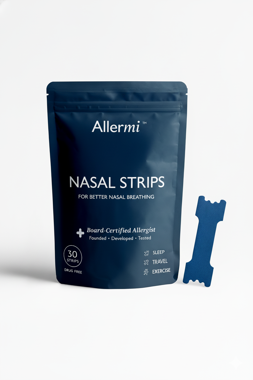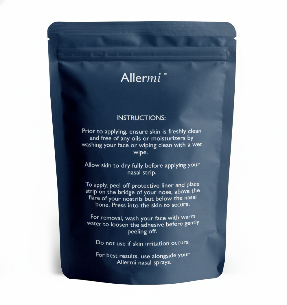 Stop struggling with stuffy noses, snoring or restricted breathing. Allermi's Nasal Strips use a comfortable, flexible lift-and-hold design that opens your nasal airways. Get back to clear breathing, day or night. Use alongside your Allermi nasal spray for optimal relief.